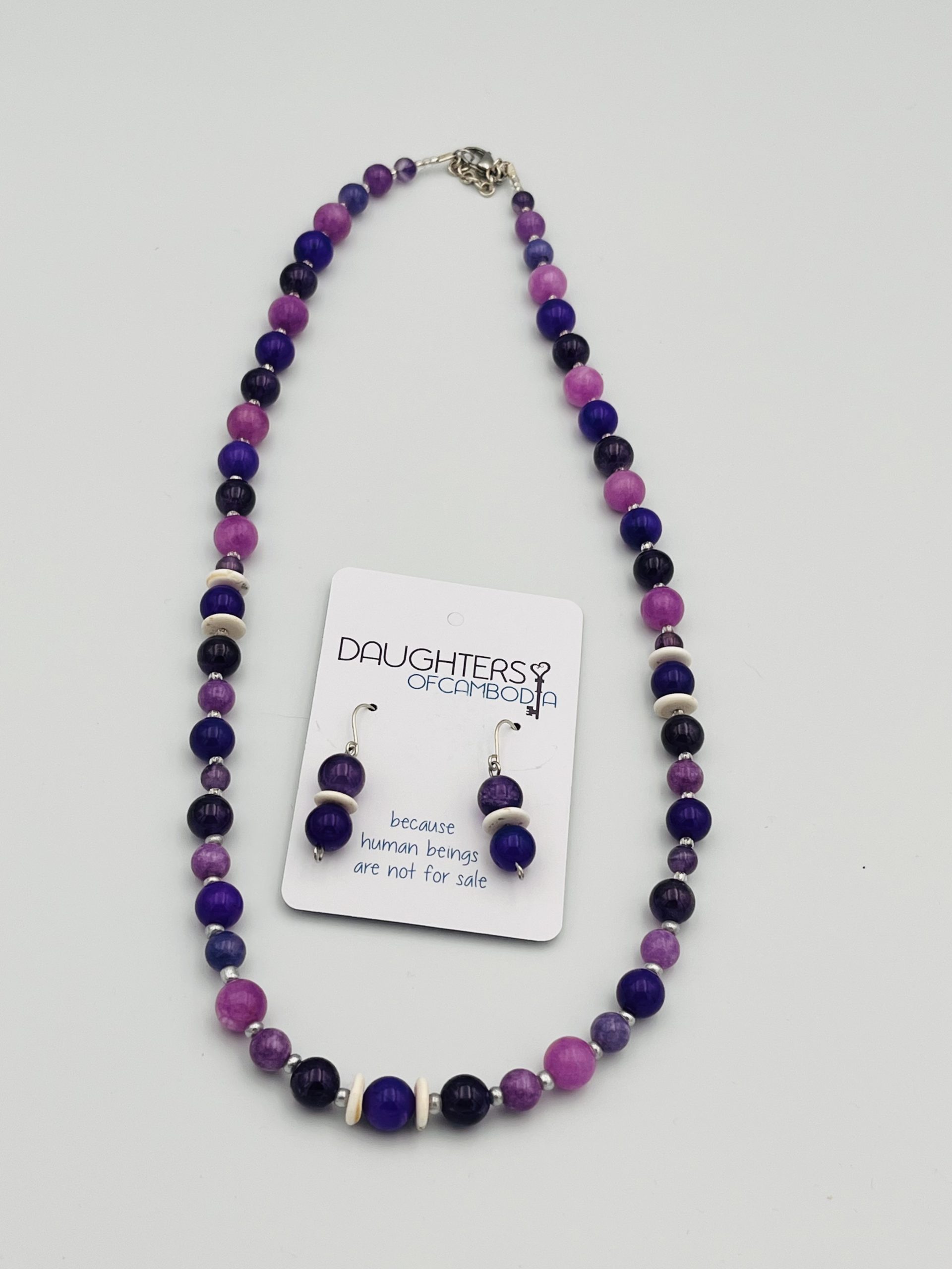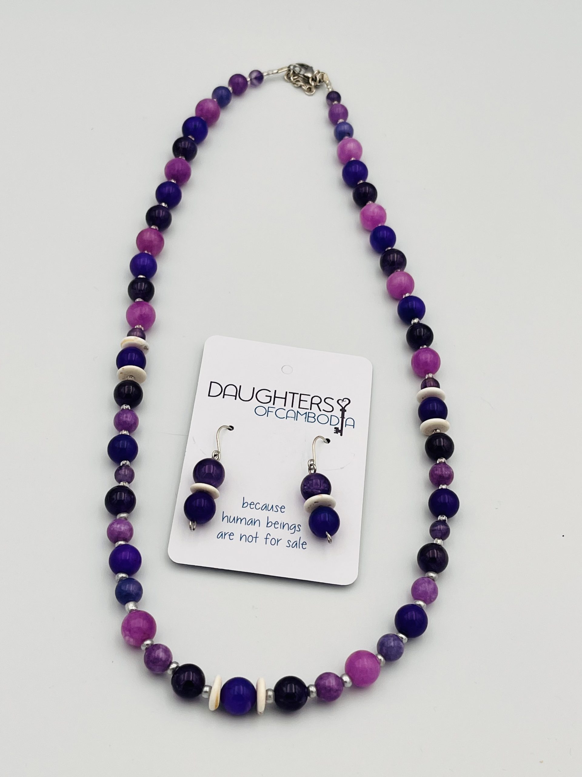 Add a touch of elegance with meaning. This stunning necklace and earring set features a harmonious blend of purple and pink tones, carefully handcrafted by resilient artisans in Cambodia. Each piece is more than just jewelry it’s a symbol of strength, hope, and renewal.